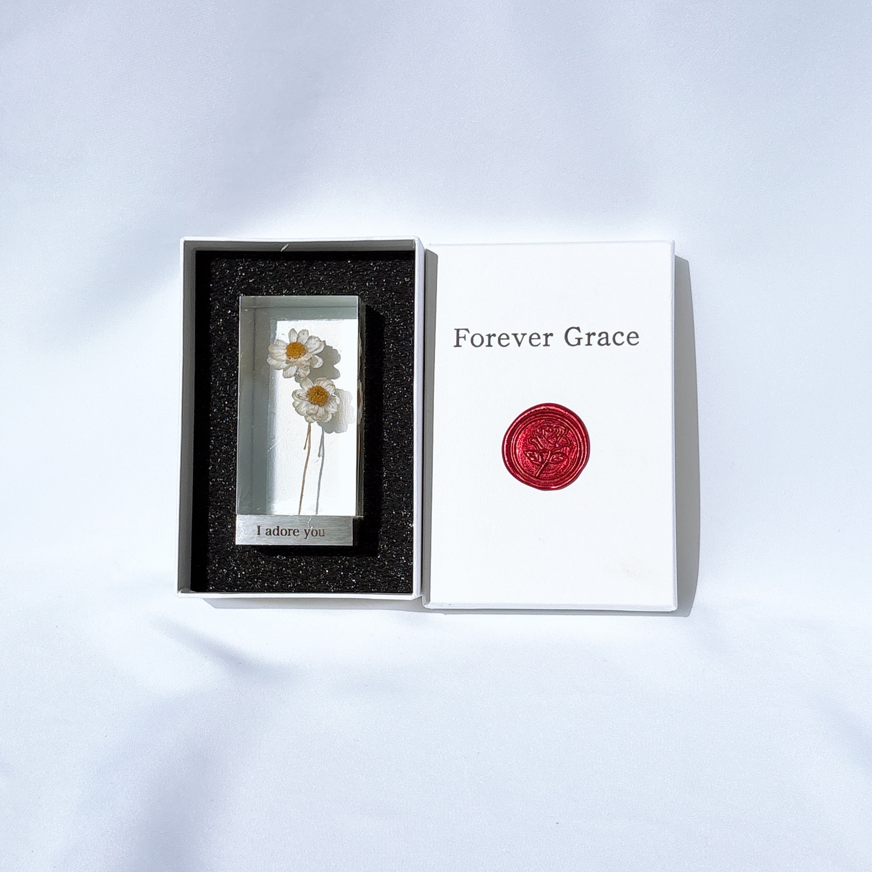 「Crystal Paperdaisy」は、美しさを永遠に保つ花かんざしのオブジェです。 生花は枯れてしまいますが、このオブジェは永遠に美しさを保ち、想いを保存することが出来ます。土台部分には、無料で自由に刻印が可能です(15文字以内)。